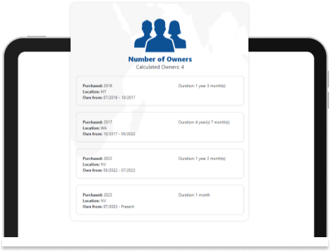 Easily verify vehicle possession using our report, which furnishes details about past vehicle proprietors, alongside ownership tenure and whereabouts. Our report unveils: